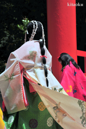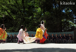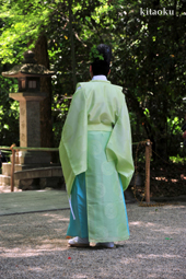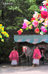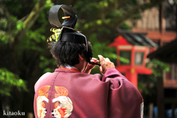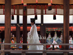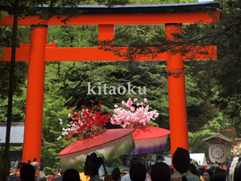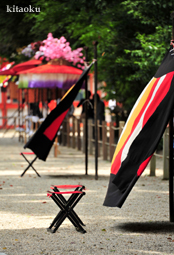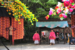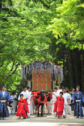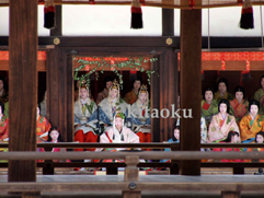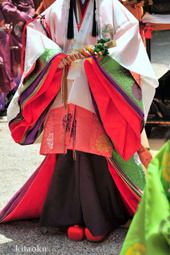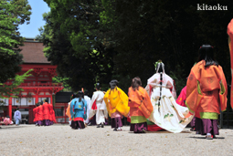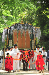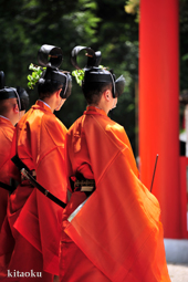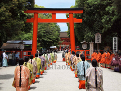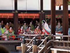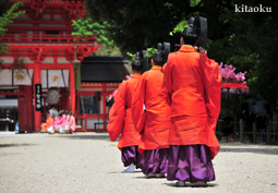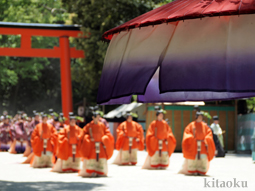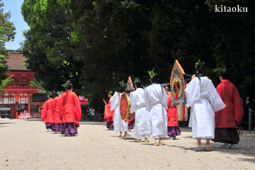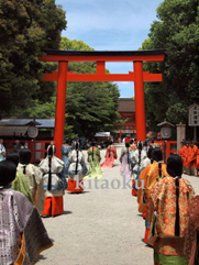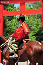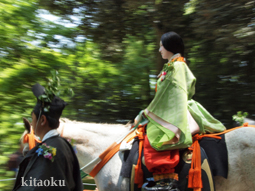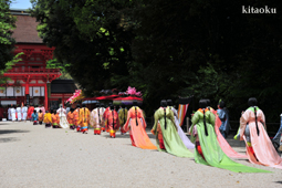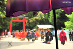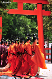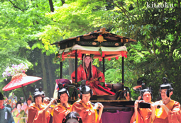 祭儀は、「宮中の儀」「進発の儀」「路頭の儀(行列)」「社頭の儀」の四つからなり、路頭の儀(行列)は、総勢511名、馬36頭、牛4頭、牛車2台、輿1台の平安貴族そのままの風雅な王朝行列が、京都御所を出発し下鴨神社へ、さらに上賀茂神社へ向かいます。 |