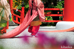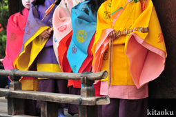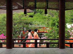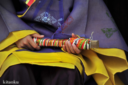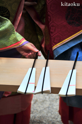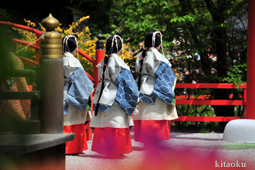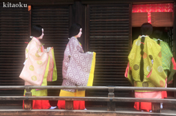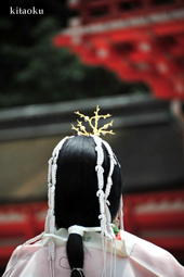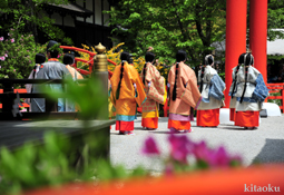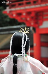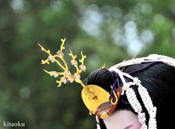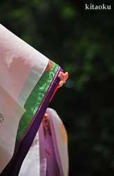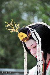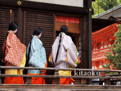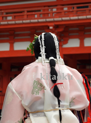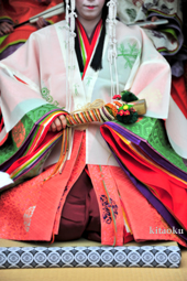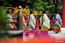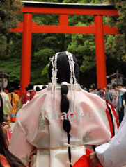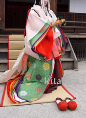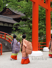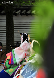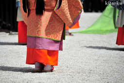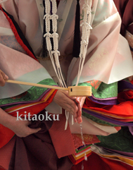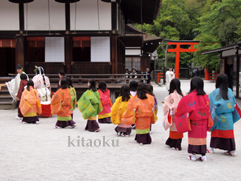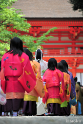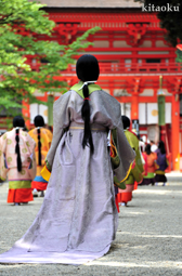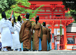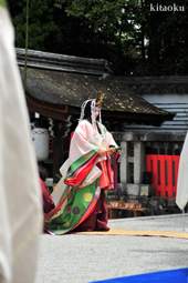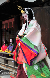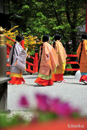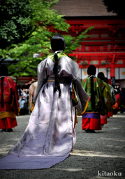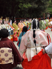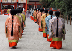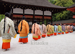 十二単衣の斉王代はじめ、宮中女官の正装姿は平安朝文化の粋を集めた王朝 絵巻を彷彿させてくれます。 |