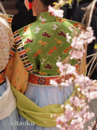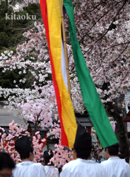 桜の名所として知られる平野神社で花山天皇の985年(寛和1)4月10日に行事が始まったと伝えられる祭。境内の約50種類の桜が咲き誇る中、騎馬や織姫達の神幸列が繰り出され午前中は本殿での桜花祭(祭典)の後、花山天皇陵を参拝。午後は鳳輦をはじめ天平の織り姫や鎧騎馬武者が行列に参加する。境内は桜の名所で特に夜桜がいい |