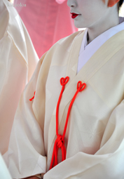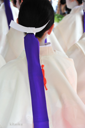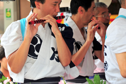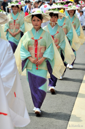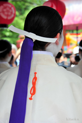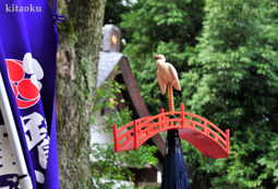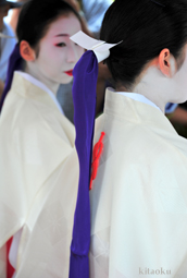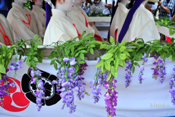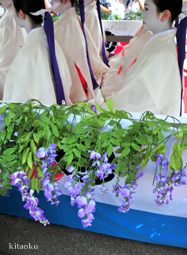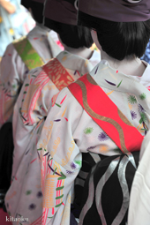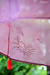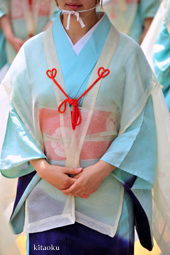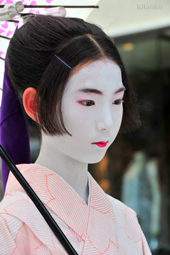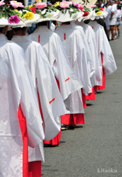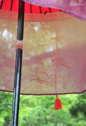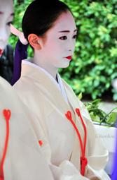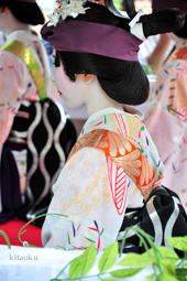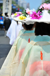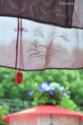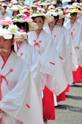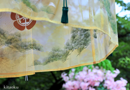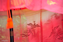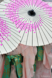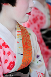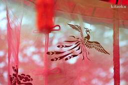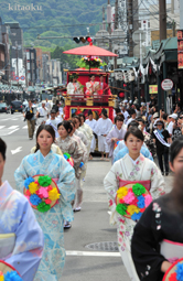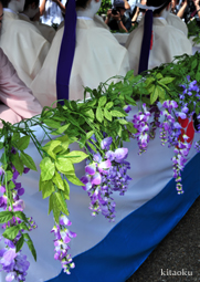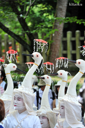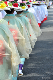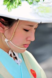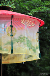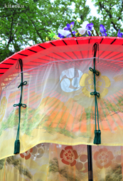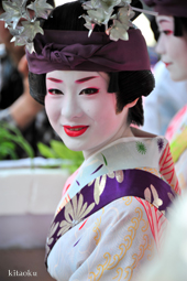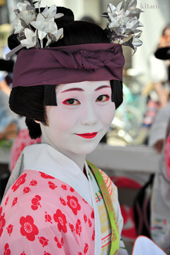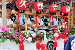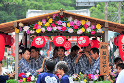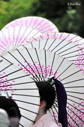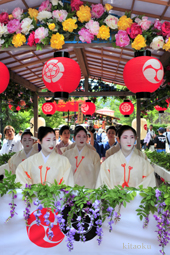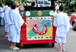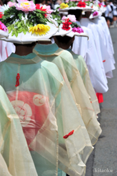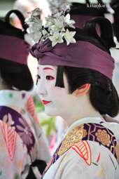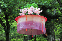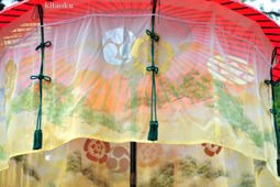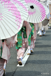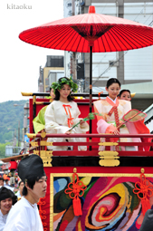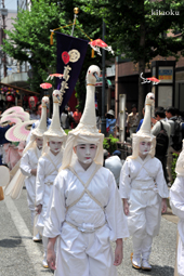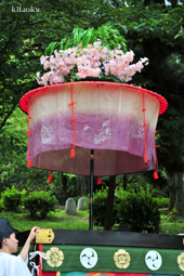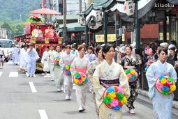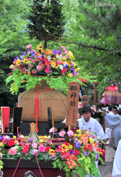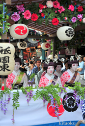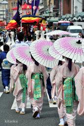 山鉾巡行は以前、7月17日(前祭 山鉾20基)、7月24日(後祭 山9基)の2回にわかれていました。昭和41年(1966)、後祭が17日に合流し、後祭の行事が喪失したために興されたのが、花傘巡行のはじまりで7月24日に行われる。花傘は、山鉾巡行と異なって芸能的色彩が非常に濃く、巡行するものと観るものとの、祈りを共にする一体感の感じられる祭りであります。 |