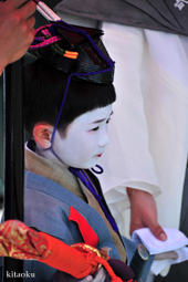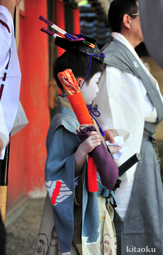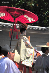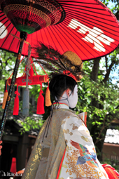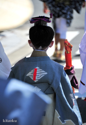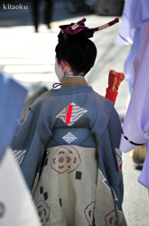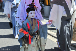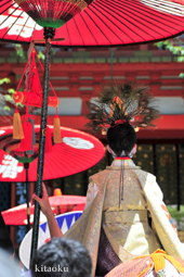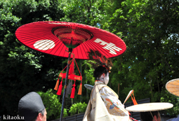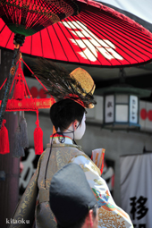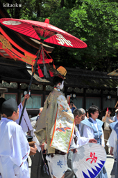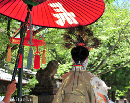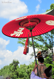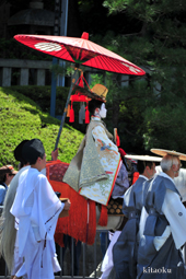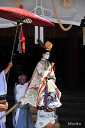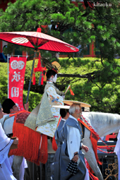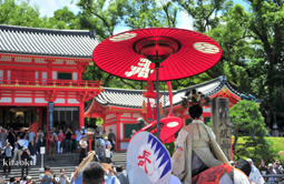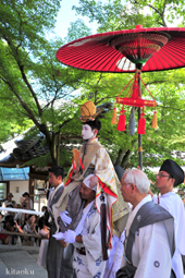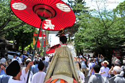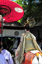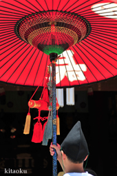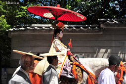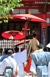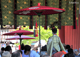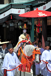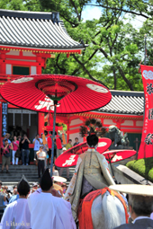 長刀鉾稚児が騎馬にて八坂神社に詣で、五位少将・十万石大名相当のお位を授かります。「お位貰いの儀」と呼ばれ、7月13日に行われます。