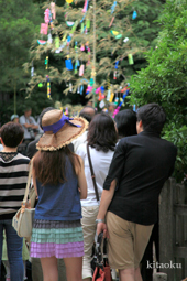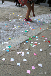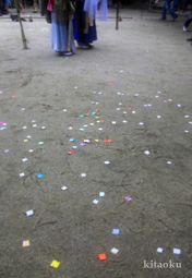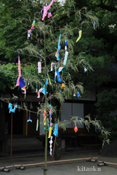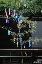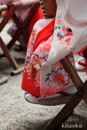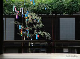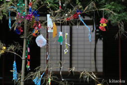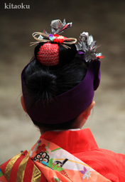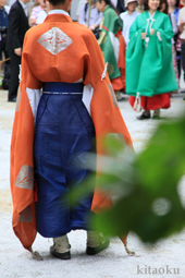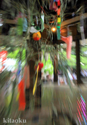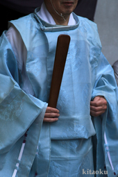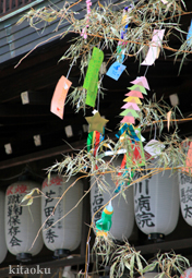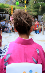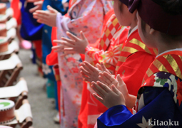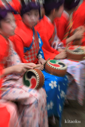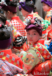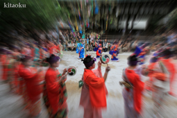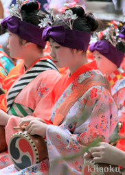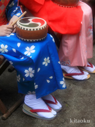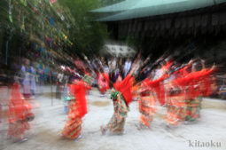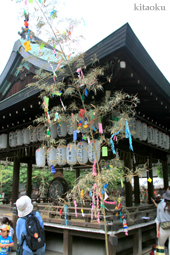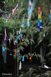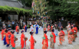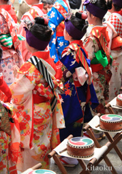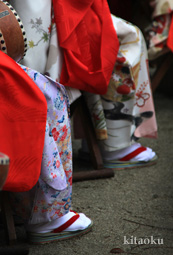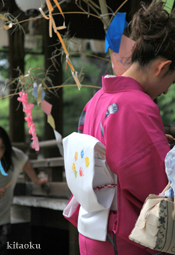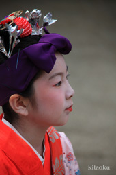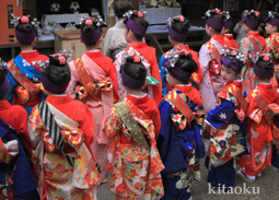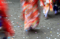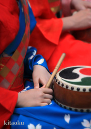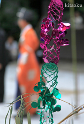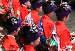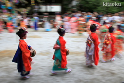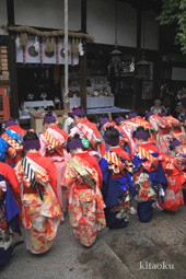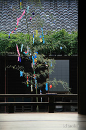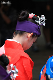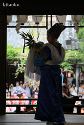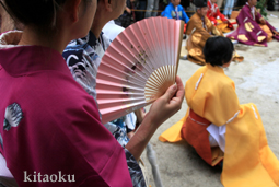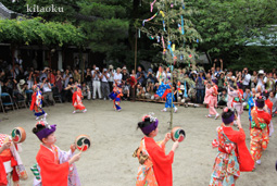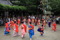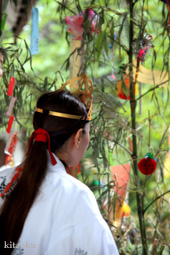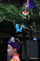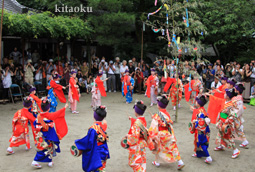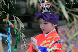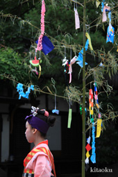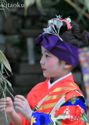 7月7日。精大明神祭と「蹴鞠(けまり)」奉納神事の後、少女たちが七夕の大笹を廻ってあでやかに踊る夏の風物詩です。元禄の頃に西陣の乙女た ちが技能・芸能の上達を祈って踊り歩いた故事に因み昭和37年に復活させた行事です。 |