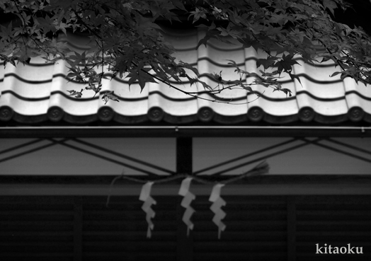 社務所に懸けられた三枚の御幣が「これより中は神域」と語る。