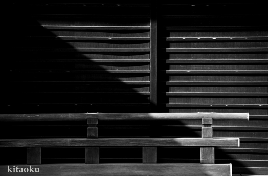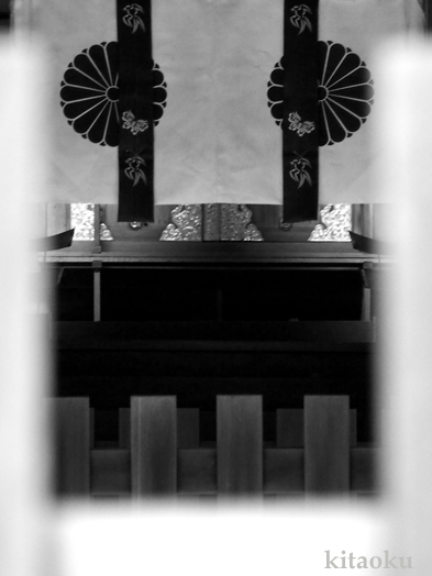 その奥にある神饌所。直線が交わる意匠が参拝者の気持を引き締める