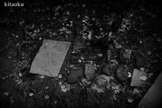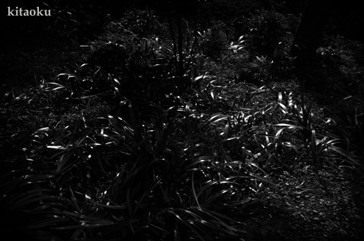 天の岩戸へ向かう登り道にさしかかるとあたりが暗くなり濡れた藪の葉だけが光る。まるで