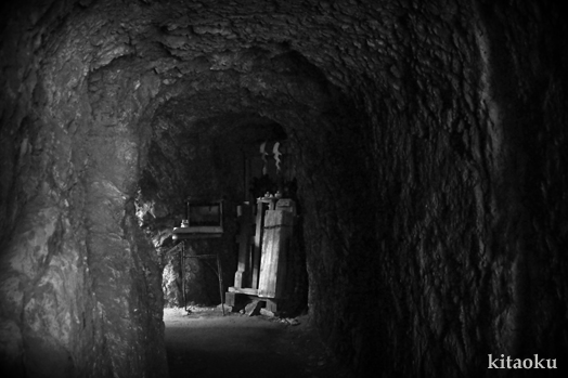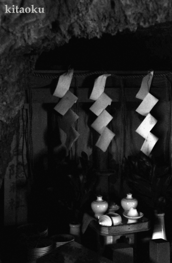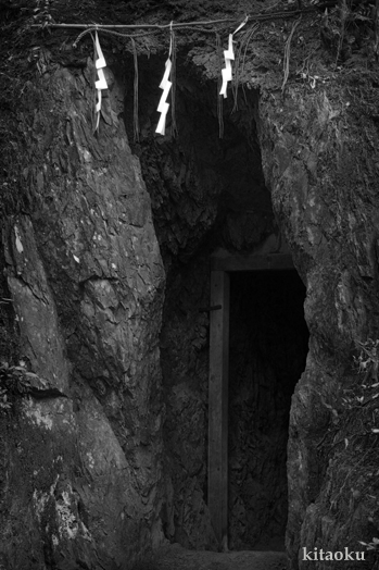 天の岩戸の入り口にはやはり三つの御幣が懸かる。中は暗く、足を踏み入れるのに躊躇する。