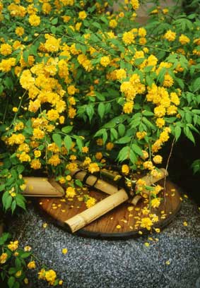 さてこの美しい山吹の写真は松尾大社(西京区嵐山)である。4月中旬から下旬にかけておよそ3000株が咲き誇り、広い境内一面が黄金色となる。拝殿前の用水路の両側が特に見事で、近くにある水車やこの写真のつくばいなどを入れれば構図をまとめやすい。