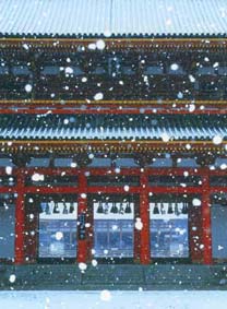 上の写真は平安神宮(京都市左京区)の応天門である。雪だけでは単調になりやすいので門の朱色をアクセントに入れ、大型のストロボを発光させて近くの雪を大きく写して動感を出した。