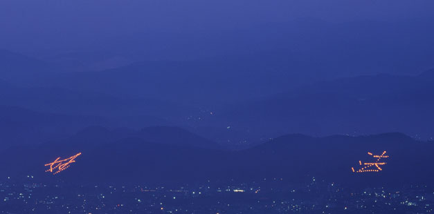 この行事が「大文字焼き」と呼ばれることがあるが、祖先の霊を冥府へ送る盆行事なので「送り火」が正しい。燃えさかる炎が照らし出した文字が消えてゆくさまを見ていると「山焼き」でないことがよくわかる。