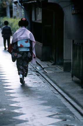 先斗町の路地からあいさつの声が聞こえ、舞妓がそれに答えながら足早に通りすぎる(下の写真)。京ことばのやさしいひびきを京都以外の人が聞くとたまらない魅力を感じるらしい。
