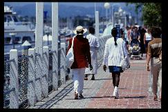 そこで まずLAに最も近いヨットハーバーのマリナデルレイを訪ねました。その中の「フィッシャーマンズビレッジ」は一年中観光客の絶えない人気スポットです。プロのKさんは早速白いボートを遠景に取り入れオシャレな女性をあしらって観光写真にまとめました。アマのTさんはそこに乱舞していたペリカンの顔を望遠ズームで見事にとらえています。やはり二人のレンズは全く違う方向に向けられていますね。