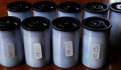 さあ いよいよ明日はLAともお別れです。それまでに撮影したものをKさんは机の上に並べてみました。右の写真を見れば分かると思いますがフィルムケースにナンバーが書かれたシールが貼ってあります。これは撮影順を表すもので何番のフィルムに何が写っているかをメモしておけば後で現像する時にある程度の露出のコントロールができます。たとえば70番に大切なものが写っているとしますとその前後の69番か71番を先に現像すれば大体分かりますのでそれより明るくしたければ増感現像を、反対に暗くしたければ減感現像を指示すればよいわけです。失敗が許されないプロの安全対策のひとつです。