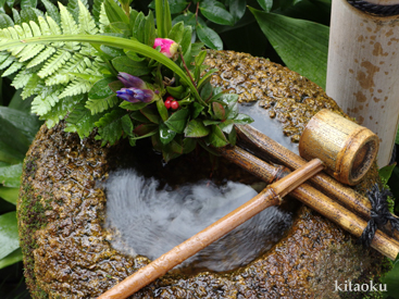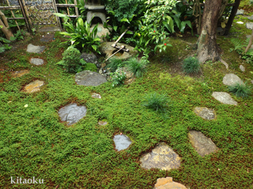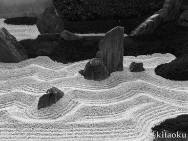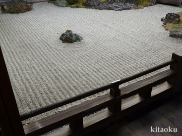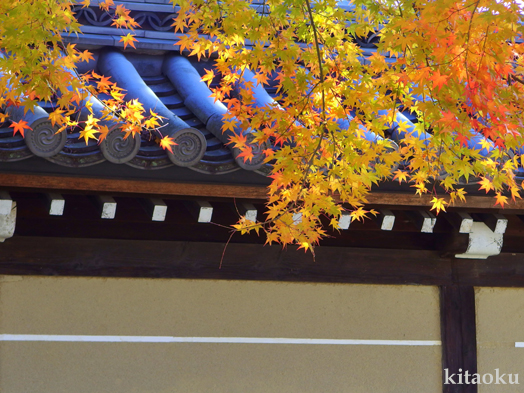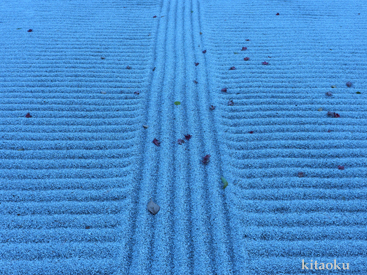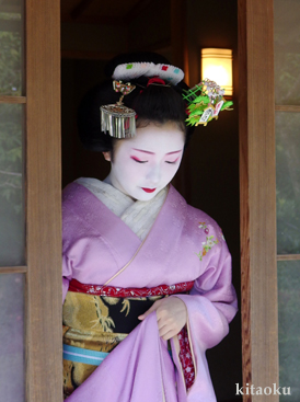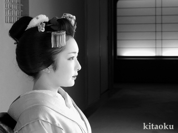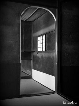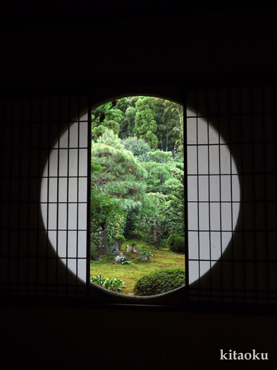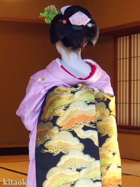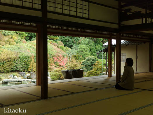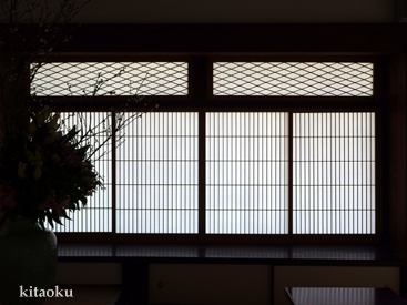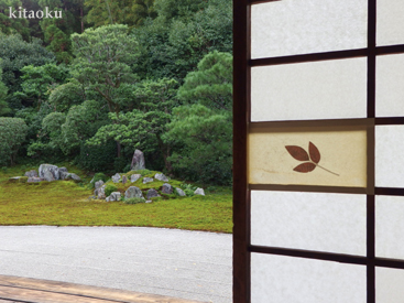 障子に貼られた一枚の葉が背景の鶴亀の庭を引き立てる。画面構成に細心の注意が必要である