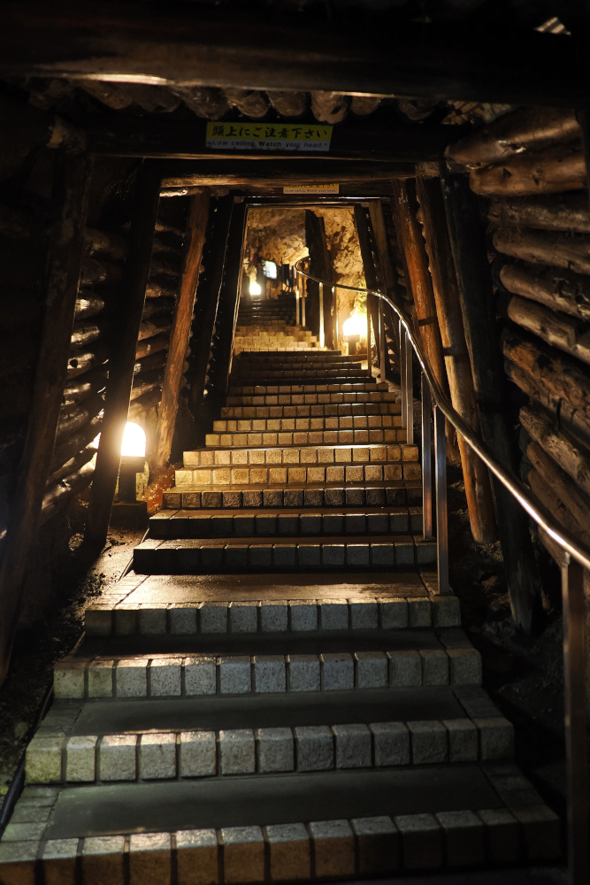 ここは江戸時代を代表する採掘方法が残された坑道です。次のような階段を上り下りして進みますが非常に寒いです。