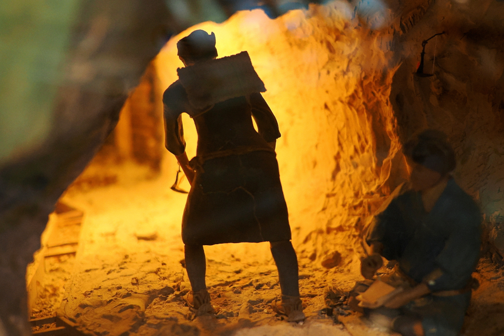 宗太夫坑を出ると展示室があり、そこに次のような坑道の模型が展示されていました。逆光に浮かぶ労働者のシルエットが印象的で、思わずシャッターを切りました。