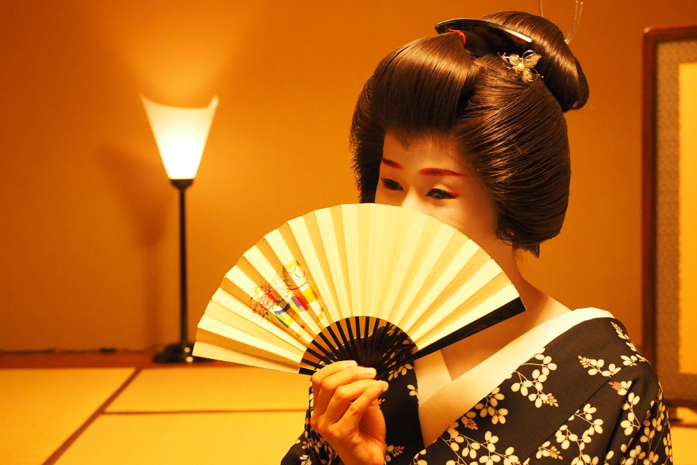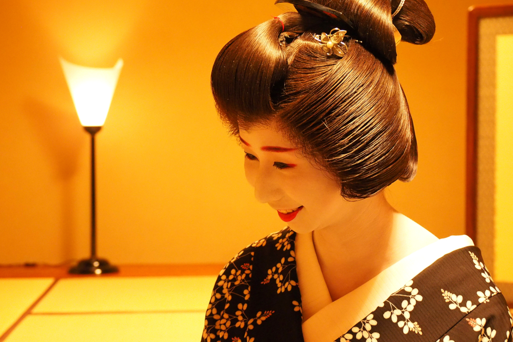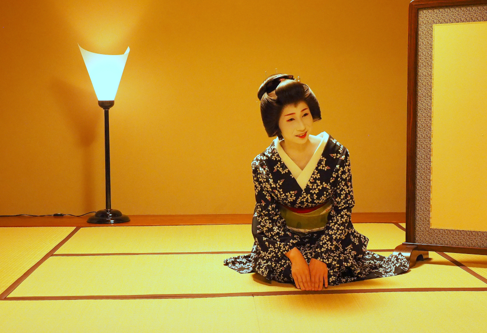 再びお座敷に戻り、今度は宴の始まりです。撮影の緊張から解放されホッとしたのか表情が柔らかくなりました。こちらもリラックスしてベストな一瞬をねらいます。