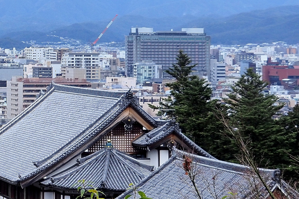 次の写真は知恩院の高台から市内を遠望したカットですが、大屋根の後方に高層ホテルがそびえます。それまで31メートルだったホテルを60メートルに建替えすることを京都市が容認した(1991年)結果です。こうして見ると他のビルと比べていかに大きいか分かりますよね。