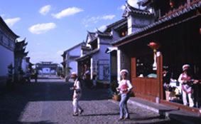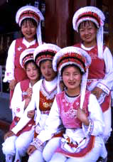 すぐ南に隣接しているのが白族村。大理という街と共に名を知られている民族ですがこの衣装も華やかでしょう?赤は吉祥、白は純潔を意味するそうです。