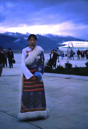次の写真を見ていただければ寒さが分かっていただけると思いますが、中甸(ジョンディアン)は迪慶チベット自治州の州都で、この案内嬢はチベット族の民族衣装で歓迎してくれたのです。衣装のあまりの立派さに寒さも忘れて撮影していて突然気付いたのですが、中国の空港内は撮影禁止。昔、うっかり撮影して公安に連行されかけたことを思い出しました。やばい!あわててカメラをしまいながら周りに目をやると、降り立った乗客達が飛行機をバックにのんびり記念写真を撮っているではありませんか。オヤッ、ここは中国とはちがうの?