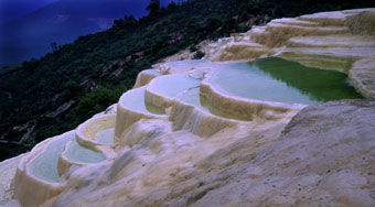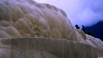 やっと到着。ロバに揺られて山道を上がった所に白水台がありました。石灰岩が棚田のように段々になった奇観です。雨ですべるのでは、と心配しましたが意外と歩きやすい。山道が舗装され沢山の人が来るようになるとここにも遊歩道ができるのでしょうねぇ。でもここには似合わない。この姿のまま見たければ皆さん、早く訪ねて下さい。