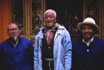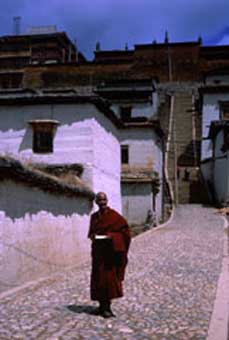 本堂から降りてきた老僧。チベット世界そのものですね。