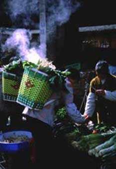 翌朝、ホテルの横の朝市へ。背の籠が野菜で一杯です。