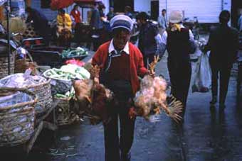 この日は早起きしたので眠くって部屋に入るなりベッドへ。目を覚ましたのは午後でした。遅い昼食を済ませてから街が一望できるという大亀山へ歩き出します。出会う人々にカメラを向けると恥ずかしいのかイヤなのか、下を向いたり逃げたり。このオバさんは微笑んでくれました。唯一の運搬手段でしょうか、皆が荷を背に負っています。 |