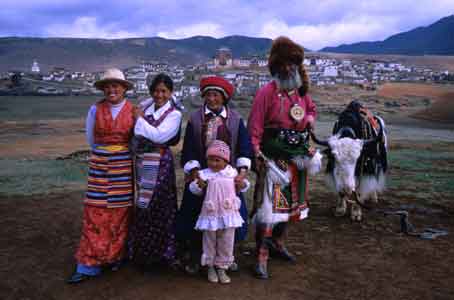 次に雲南省最大のチベット仏教寺院、松賛林寺へ。タクシーが案内してくれたのがこの絶景の撮影場所です。右の立派な衣装の男性が記念写真のモデルで一回10元(130円)。陽気な家族と共にしあわせそうでした。後方に聳え立つのが松賛林寺。