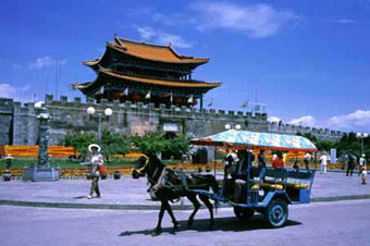 さてこれが大理古城の南城楼。馬車が良く似合うでしょう?バスを降りた後、馬車でホテルまで行ったのですが、ひずめの音を聞きながらのんびりゆったり…、大理の観光はこれに限ります。