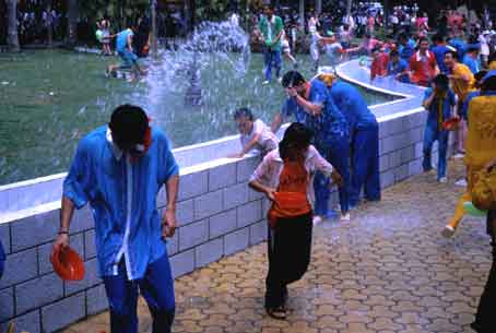 早速街へ出てみました。病み上がりのせいか暑さがこたえます。まず曼聴公園へ。歓声のする広場へ行って驚きました。なんと、水かけ祭をやっているではありませんか!これは毎年4月中旬(タイ族の正月)に互いに水をかけあって祝福する祭で今月もやっているとは思いませんでした。これはラッキー!水をかけられないようにして撮影。