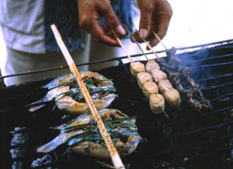 体調もすっかり快復したようでこの屋台の“におい”がたまらず、一串ずつ注文しました。真ん中の豆腐と左の魚が珍味でした。これにビールがあれば…。