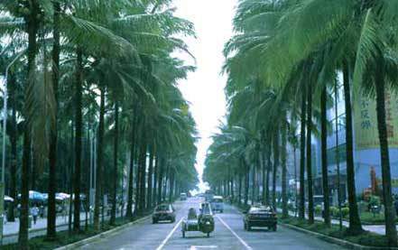 さて翌朝、歩いて景洪南路と景洪東路の交差点までやってきました。ヤシに囲まれたメインロードとサイドカー付きのバイク、いいですねえ。
