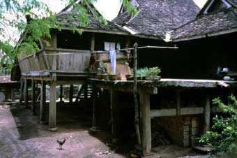 景洪の南37kmにある景勝地ガンランバにタイ族村があります。湿気を防ぐため高床式になっています。