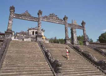 写真を見ればわかるように西洋風の建築で芸術的にもすぐれた廟である。階段の手すりには龍が刻まれ、階段の上には馬や象や役人の石像が立ち、廟を守っている。その一つ一つにカメラを向けたくなる。廟の内部も磁器やガラスで彩られ、フエの遺跡では最も見応えがある。