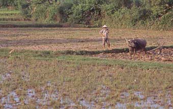 再び乗船してもう少し下流のミンマン帝廟へ向かう。今度は船着場から10分ほど歩かねばならないが、途中にある民家の人たちをスナップしたり、飼われている水牛を写したりして楽しい道程だった。ミンマン帝廟は建物の構成は中国風でその造りと美しさはフエでも一、ニを争うといわれているが三日月型の蓮池以外はそれほど写真的には魅力がなかったのが残念。
