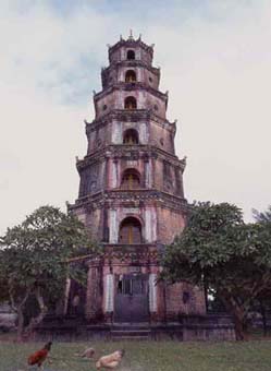 しばらくすると右手に美しい塔が見えてきた。フエのシンボル的な塔があることで知られているティエンムー寺である。船を下りて、目の前の小高い丘をあがると高さ21mの七層八角形の塔が堂々と聳え立つ。